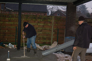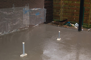De betonvloer is gegoten en we zijn begonnen met de metselwerken.
